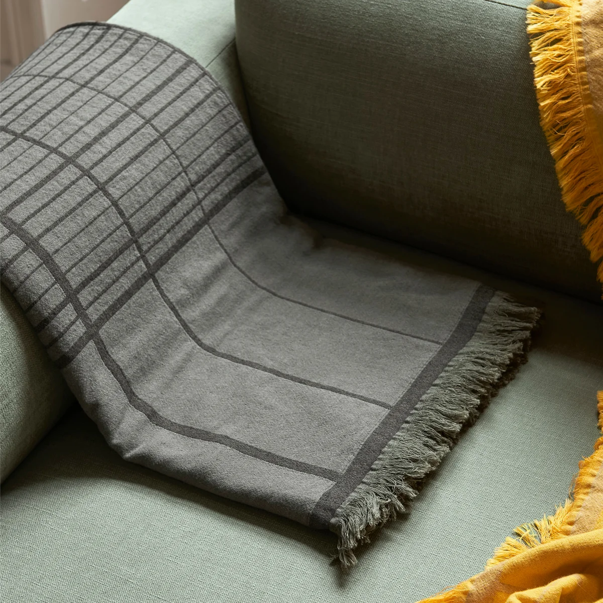 Die Untitled Tagesdecke von &Tradition ist mit einem geometrischen Gittermotiv verziert, das für einen stilvollen, grafischen Touch im Interieur sorgt. Entworfen vom Design-Studio All the Way to Paris besteht die schöne Decke aus einem Gemisch aus Baumwolle, Wolle, Viskose und Polyamid. Sie ist damit leicht und gemütlich zugleich und kann sowohl als Überwurf auf einer Couch als auch als Tagesdecke auf einem Bett dienen. Die Fransen an den Enden verstärken das gemütliche Gefühl.
