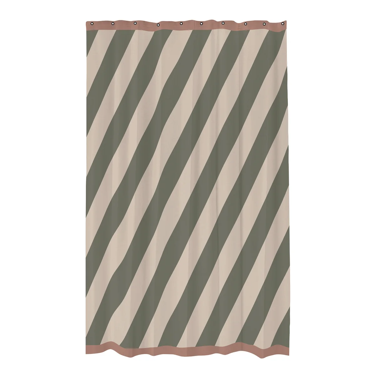 Der Diagonal Duschvorhang schafft eine ruhige und harmonische Atmosphäre im Badezimmer. Mit diagonalen Streifen in einem schönen Olivgrün bietet er ein schlichtes, grafisches Design. Schwarze Metallringe an der warmen Terrakotta-Bordüre ermöglichen ein einfaches Aufhängen.