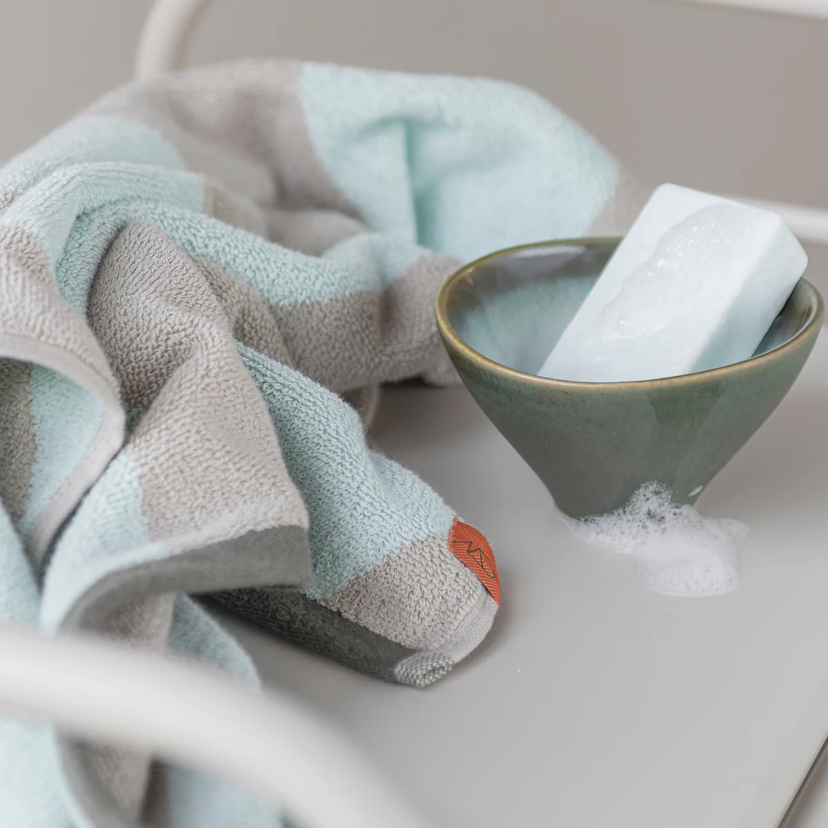Das Diagonal Gästehandtuch von Mette Ditmer bringt mit seinen breiten diagonalen Streifen und warmen Farbtönen Frische in das Badezimmer. Die olivgrüne Bordüre sorgt für einen harmonischen Kontrast, während die orangefarbene Schlaufe und das Label einen verspielten Akzent setzen. Die Tücher verbinden Funktionalität mit dekorativem Design und bestehen aus weicher, saugfähiger Bio-Baumwolle.
