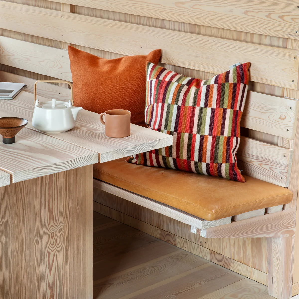 Røros Tweed ist bekannt für seine einzigartigen und hochwertigen Wollprodukte, die aus der norwegischen Tradition und Handwerkskunst entstehen. "Ida" wurde von Plaids und handgefertigten Patchwork-Quilts inspiriert. Ursprünglich fertigte Anderssen & Voll ein maßstabsgetreues Modell des Designs auf farbigem Papier an, und kleine Unregelmäßigkeiten wurden vom Papier auf den gewebten Stoff übertragen.
