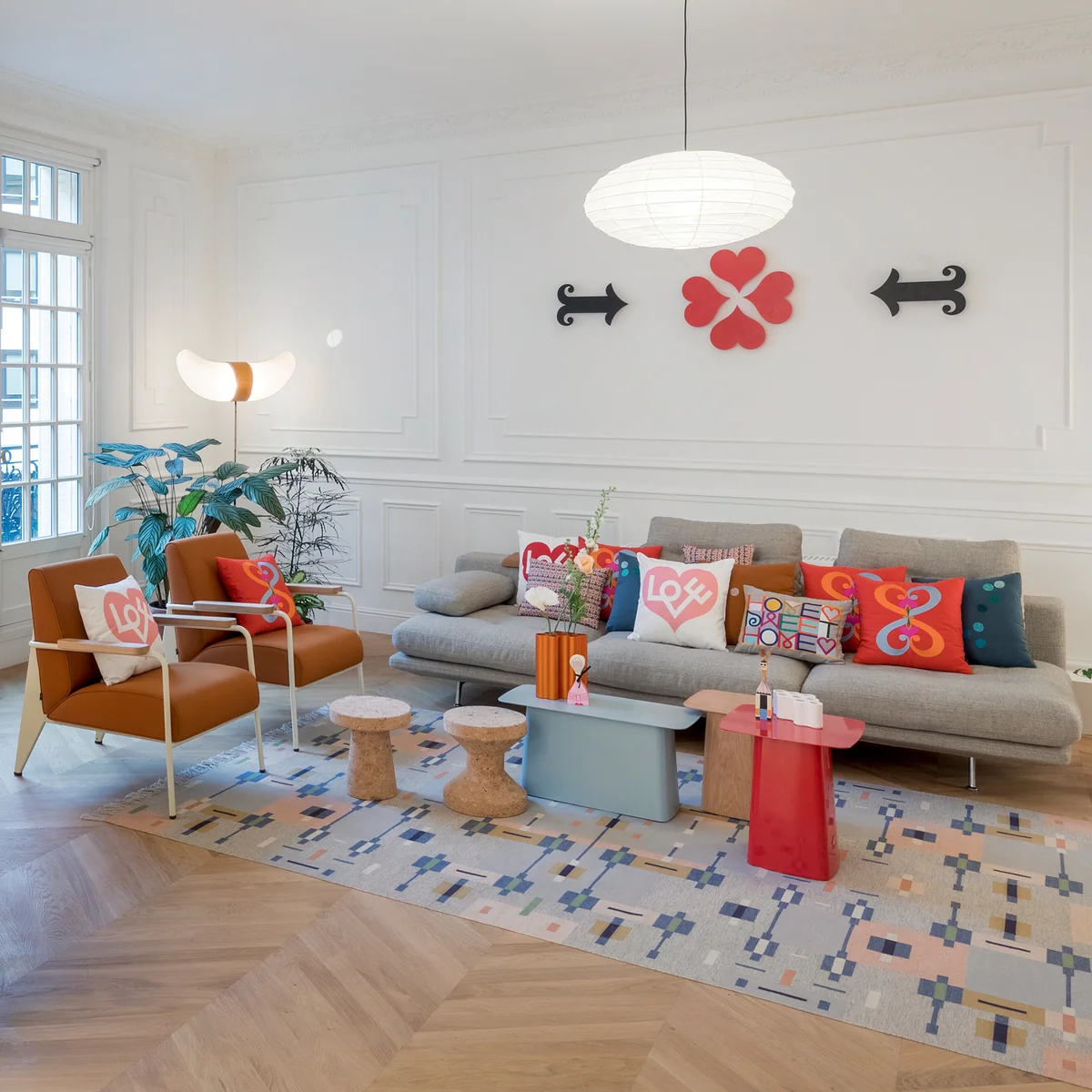 Als Textildesigner, Architekt, Interieurdesigner und Sammler entwickelte Alexander Girard von 1952 bis 1975 in Leitungsposition der Textilabteilung bei Herman Miller Materialien und Muster, die mit den innovativsten Möbeln seiner Zeit konform gehen. Zu jener Zeit entstand auch der Entwurf zum Love Kissen, das heute nach Originalentwurf von Alexander Girard von Vitra produziert wird.