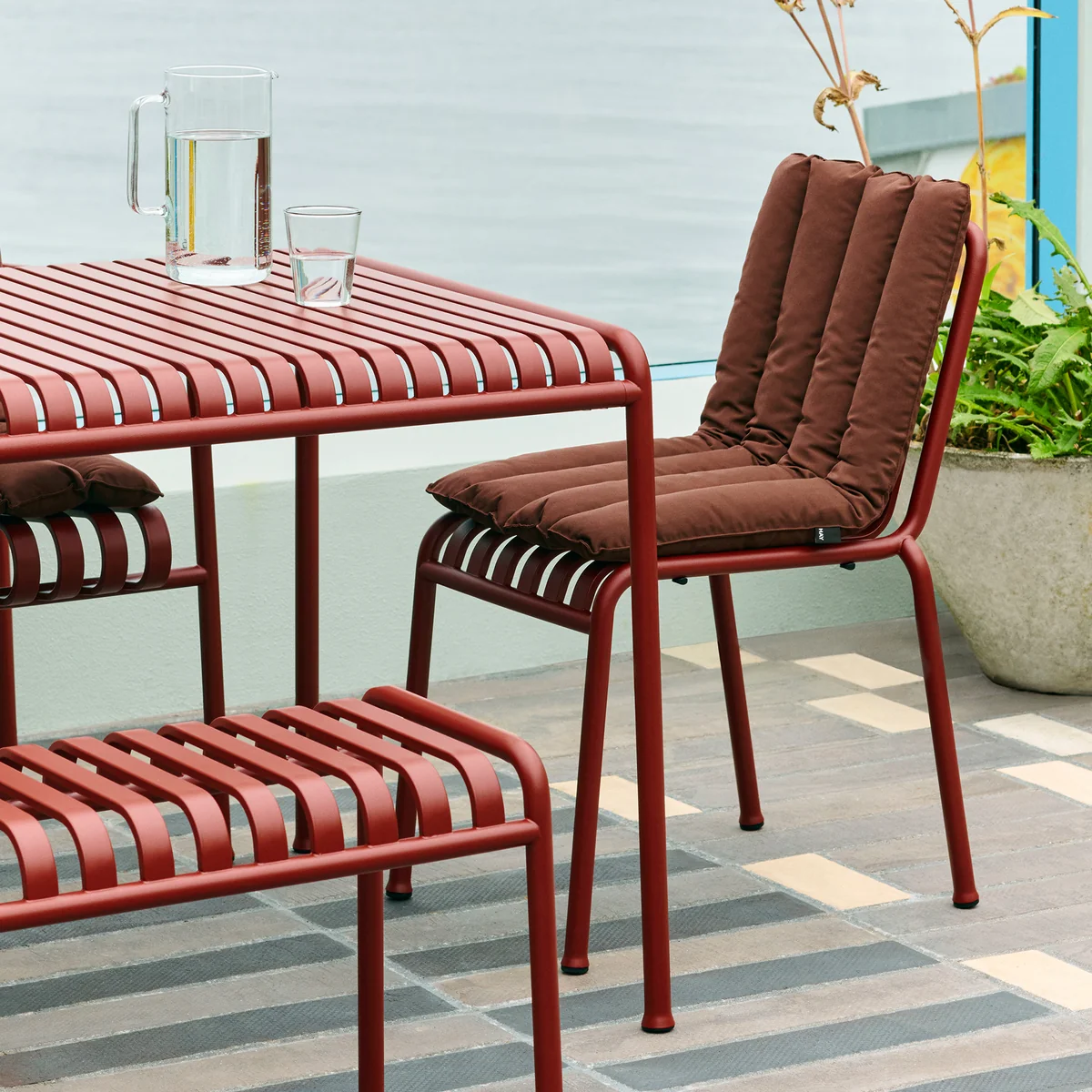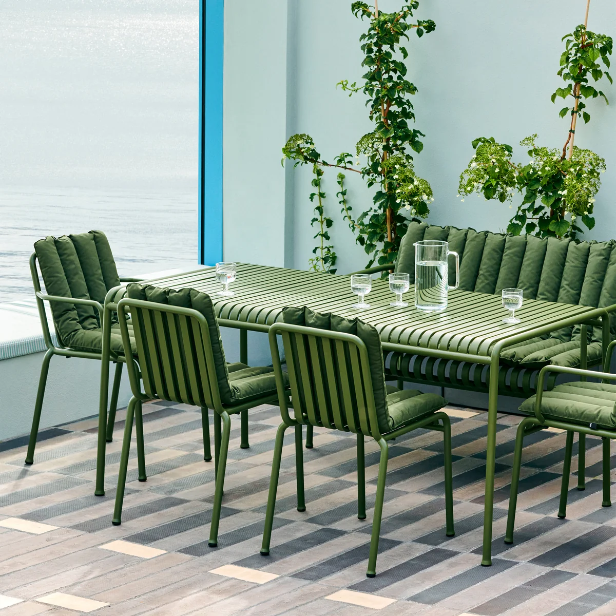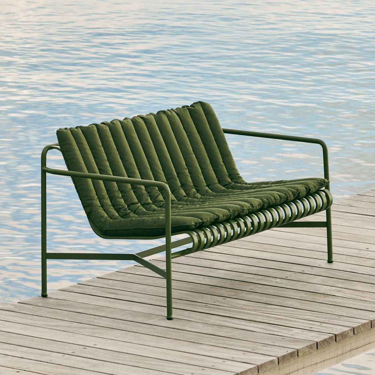 Das Palissade Soft Quilted Cushion von HAY erhöht sowohl den Komfort als auch die Funktionalität der Palissade Stuhl- und Bankkollektion und ist so geformt, dass es zu den meisten Palissade-Modellen passt. Das Kissen aus wasserabweisendem Stoff ist mit einer rutschfesten Unterseite ausgestattet und mit einer weichen Kombination aus Schaumstoffkrümeln und Silikonfaserkugeln gefüllt. Der Stoff weist eine hohe UV-Beständigkeit auf, so dass er lichtecht und farbecht bleibt. Die in vier Farben erhältlichen Kissen sind für den ganzjährigen Gebrauch geeignet.