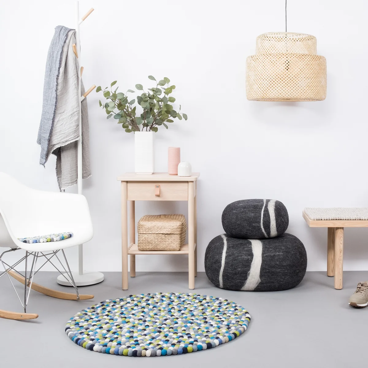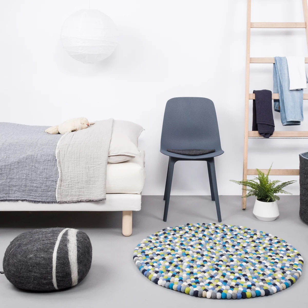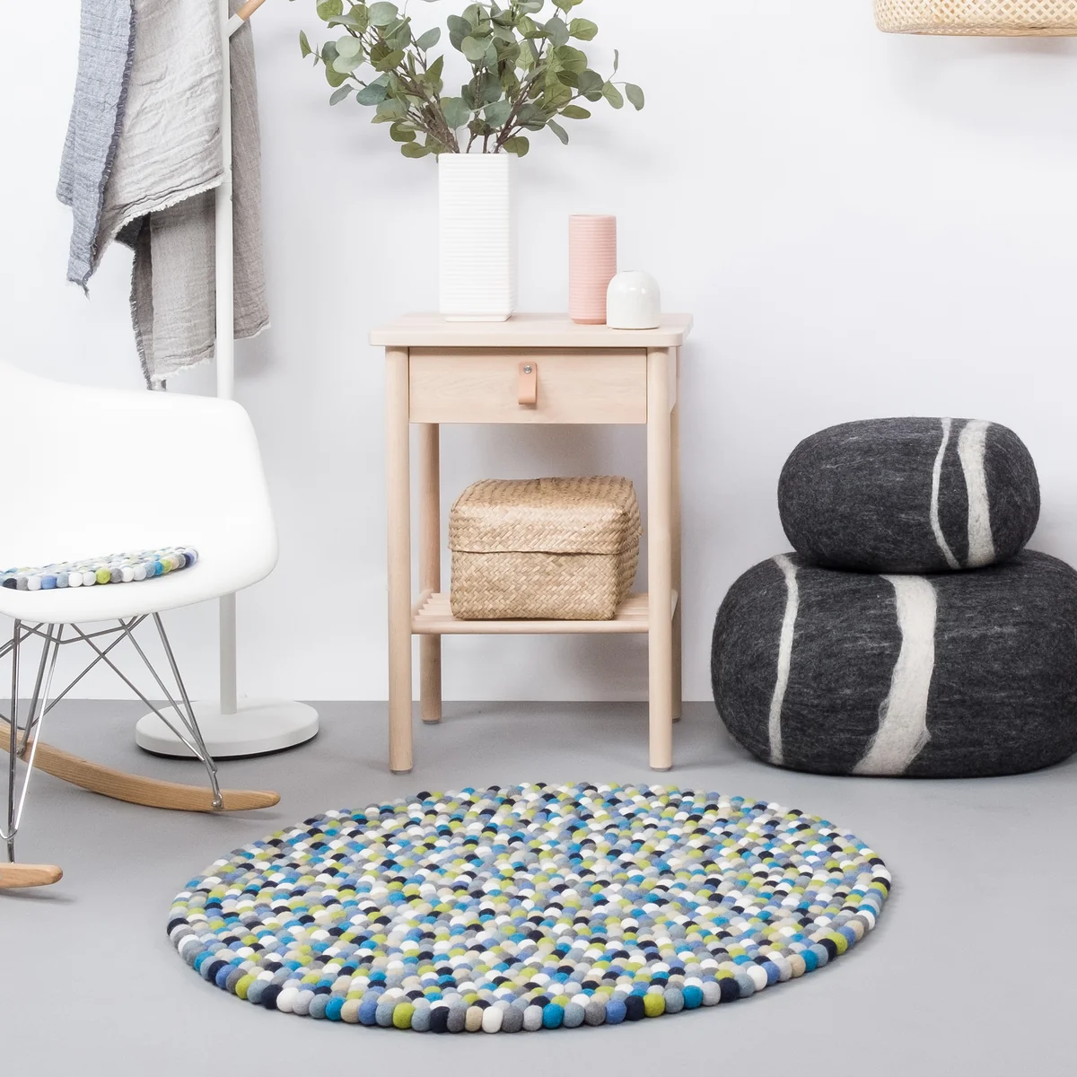 In verschiedenen Farben ist der runde Filzkugel-Teppich als runde, rechteckige und quadratische Version erhältlich.