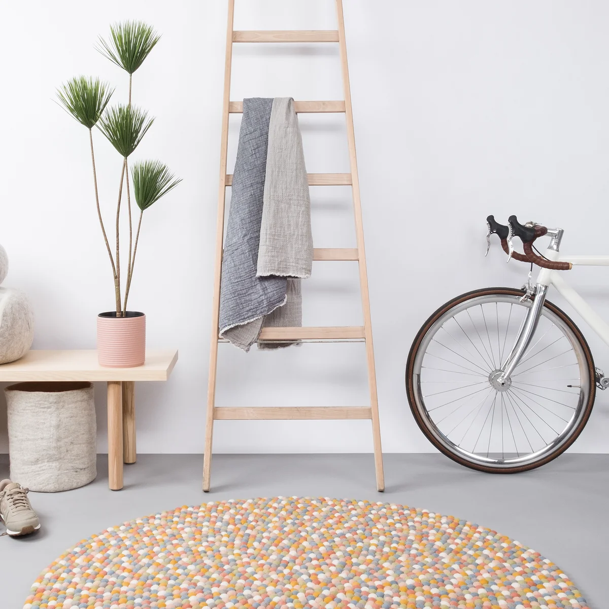 Der runde Filz-Teppich von myfelt ist kunterbunt und fällt sofort ins Auge. Seine bunt eingefärbten Filzbälle ziehen alle Blicke auf sich und bringen Freude in jeden Raum. Egal, ob im Wohn- oder Kinderzimmer.