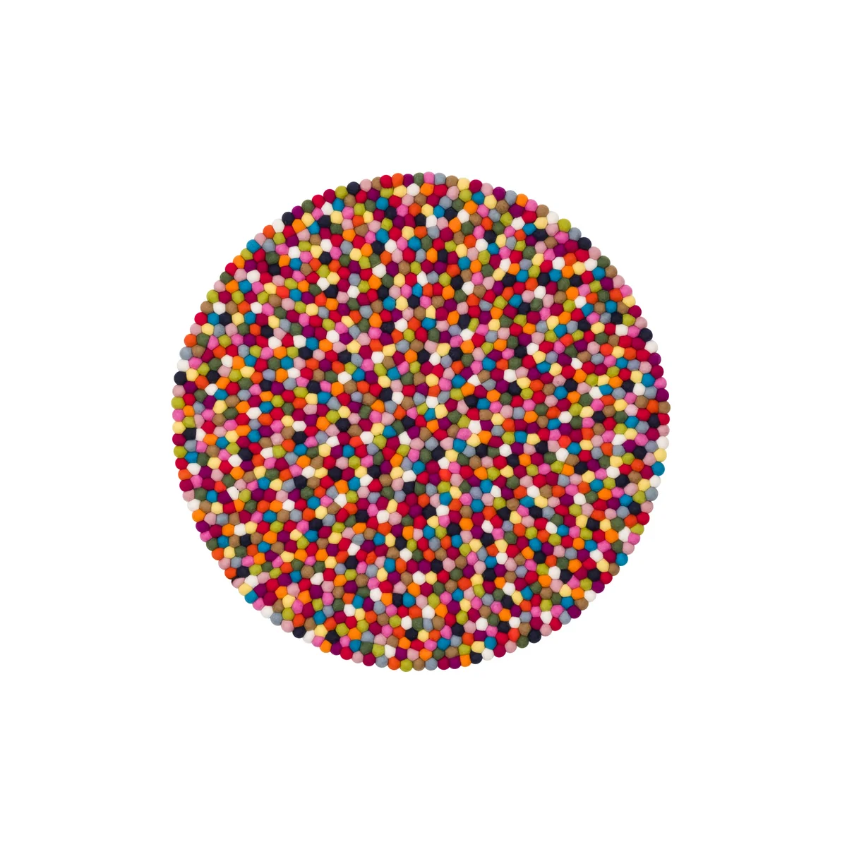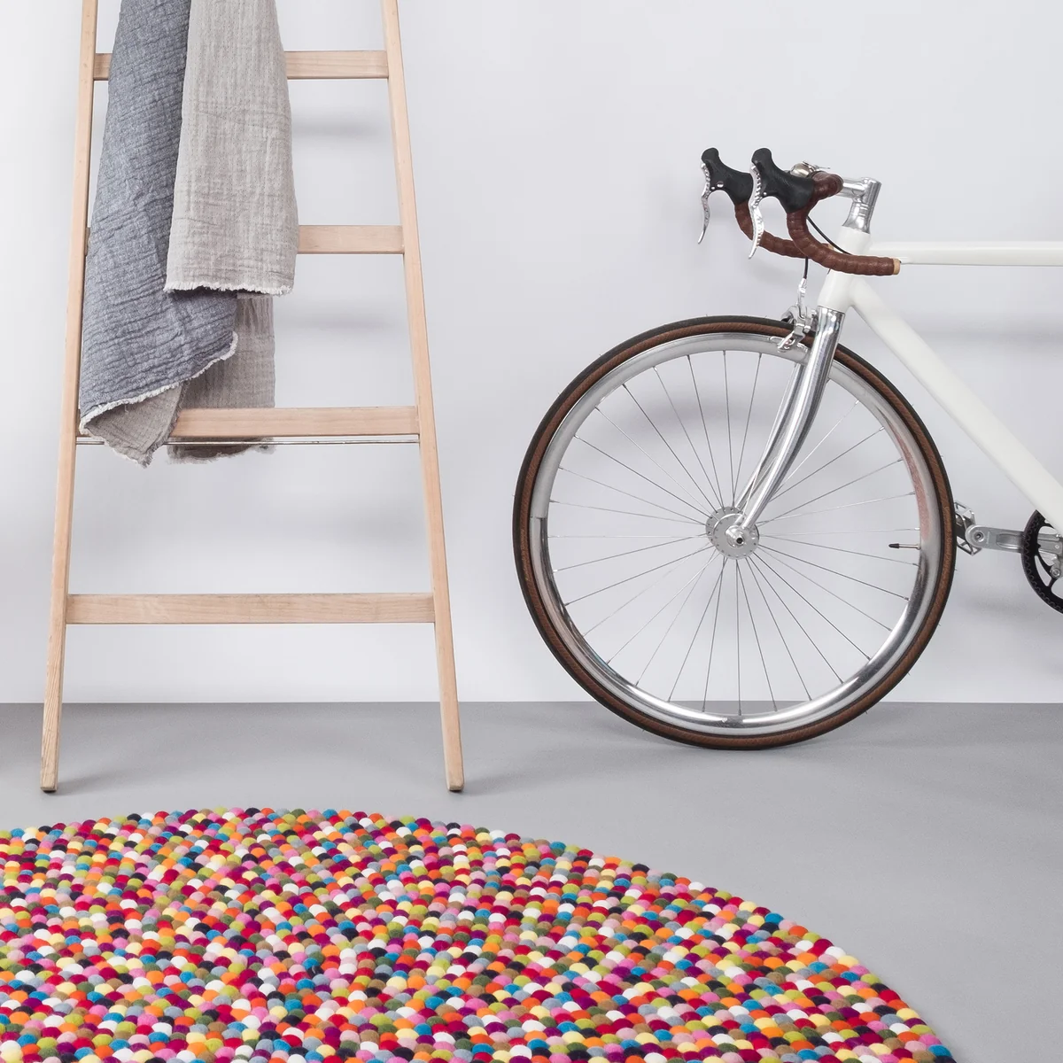 Der runde Filz-Teppich von myfelt ist kunterbunt und fällt sofort ins Auge. Seine bunt eingefärbten Filzbälle ziehen alle Blicke auf sich und bringen Freude in jeden Raum. Egal, ob im Wohn- oder Kinderzimmer.