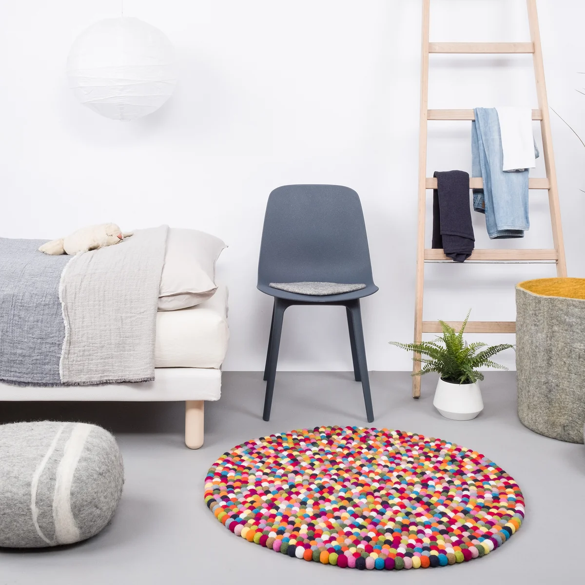 In verschiedenen Farben ist der runde Filzkugel-Teppich als runde, rechteckige und quadratische Version erhältlich.