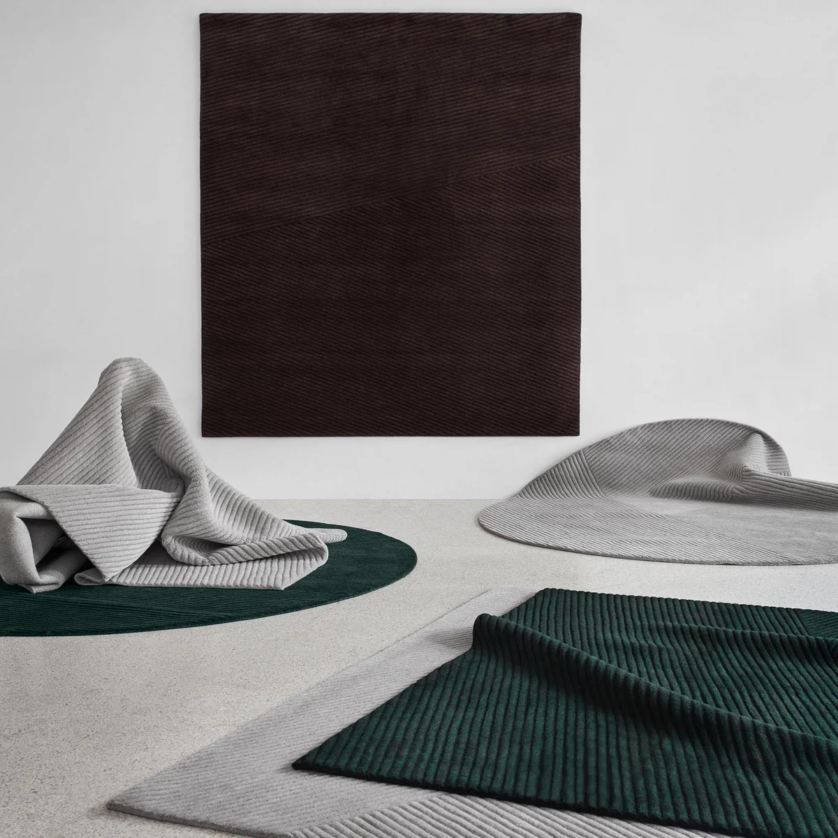 Der Row Teppich von Northern fügt sich hervorragend in jedes Ambiente ein und zeichnet sich durch sein zeitloses, elegantes Design aus. Die Oberfläche des Teppichs erinnert an ein frisch gepflügtes Feld aus der Vogelperspektive. Parallele Linien befinden sich auf dem gesamten Teppich und finden in unterschiedlichen Winkeln zusammen.