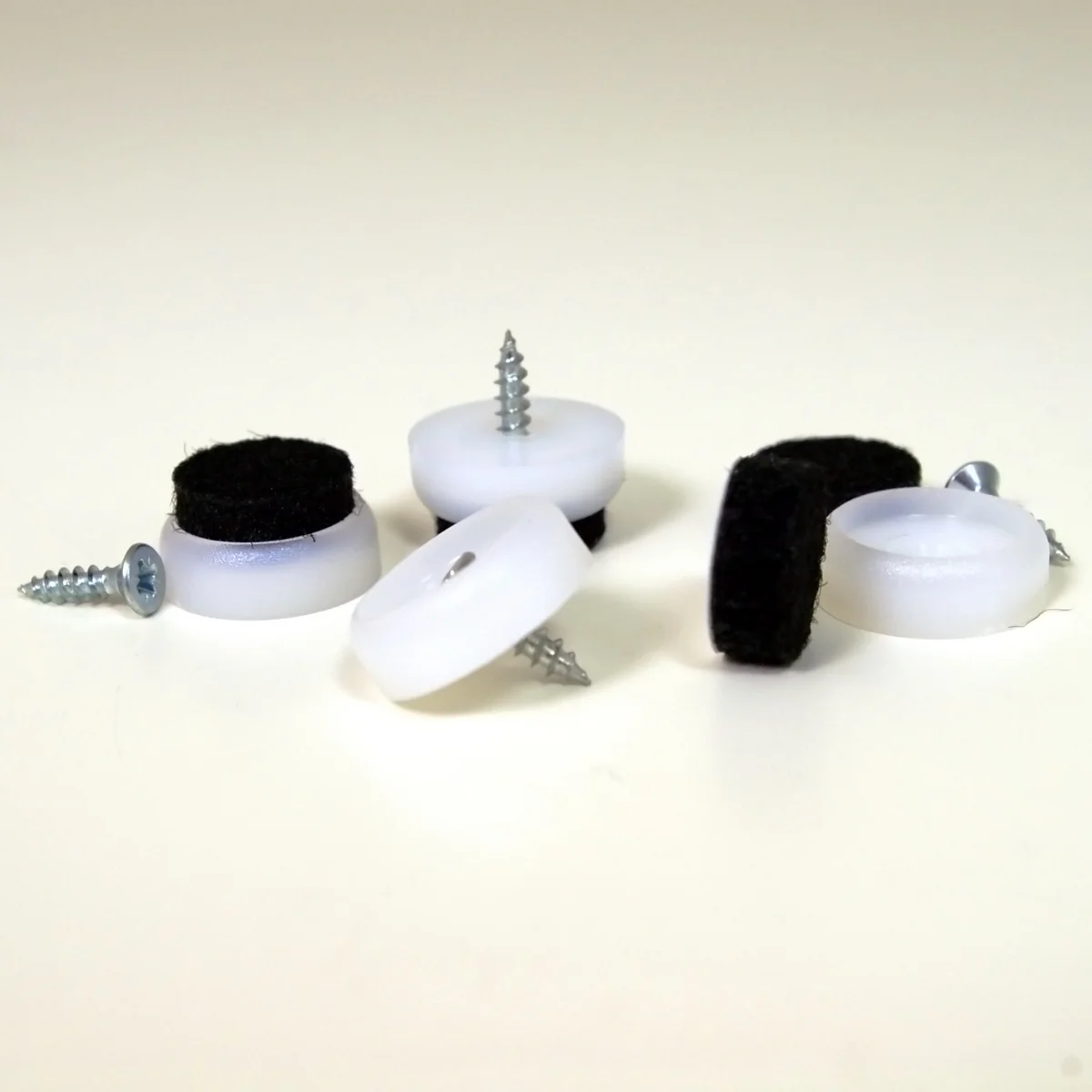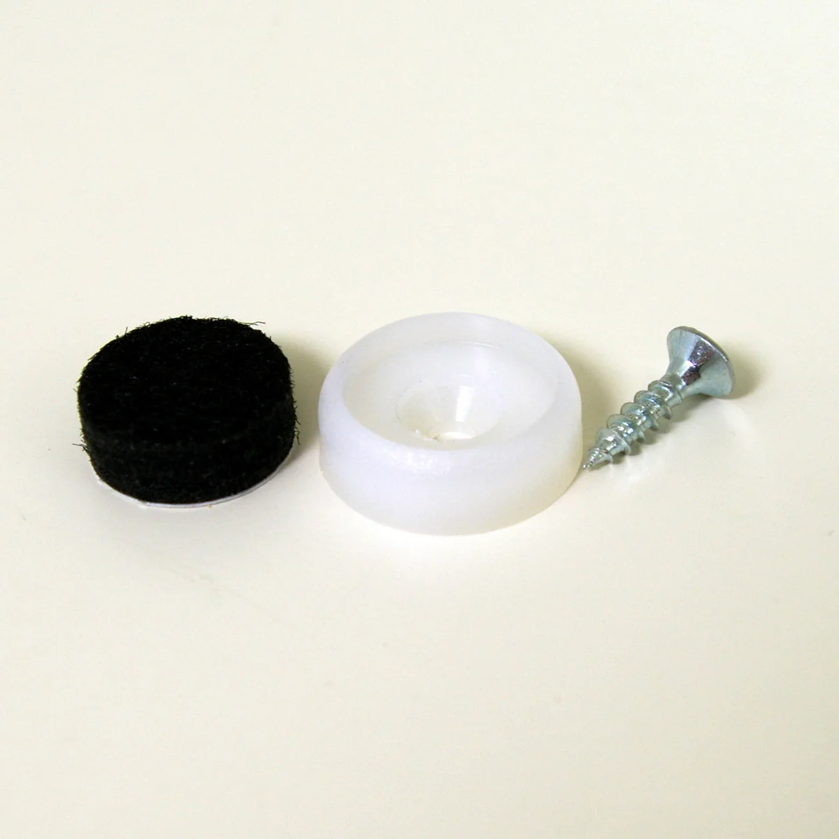 Jeder Filzgleiter für die Plastic Chairs DSW und DAW von Vitra besteht aus drei Einzelteilen, die sich problemlos unter den Stuhlbeinen befestigen lassen. Der eigentliche Filzkern der Gleiter wird in eine Fassung geklebt, die wiederum am Fuß des Stuhls festgeschraubt wird.