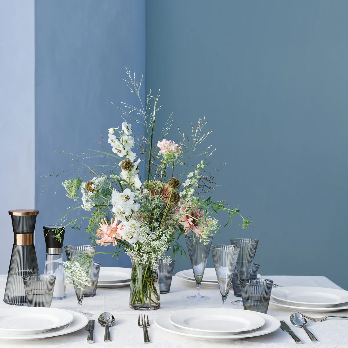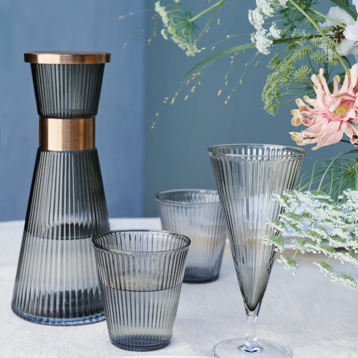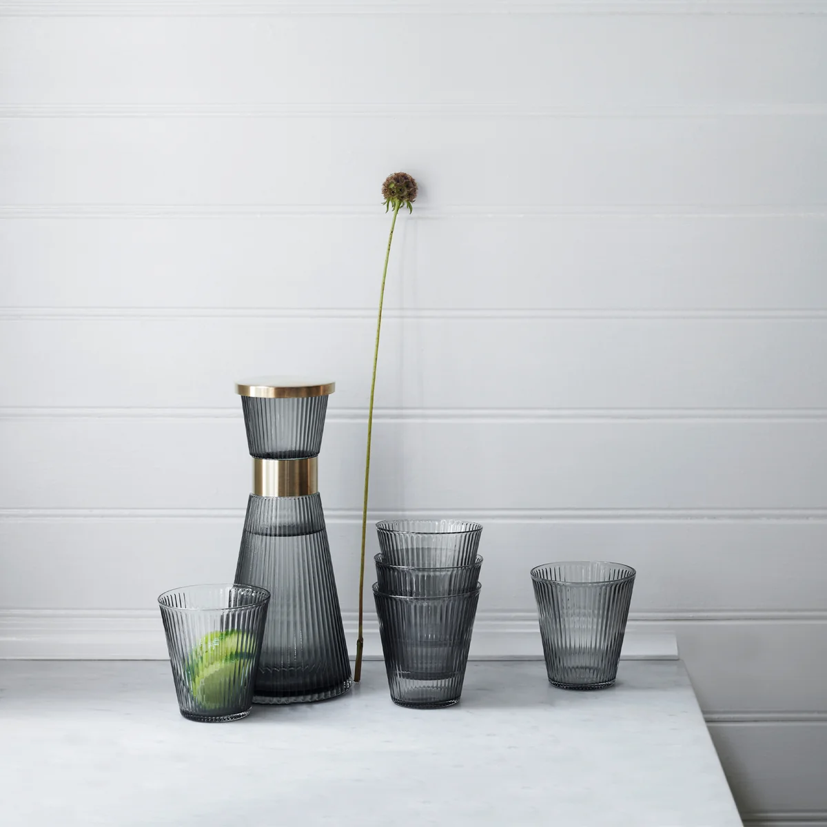 Die Grand Cru Wasserkaraffe von Rosendahl besticht durch ihre elegante Form aus bleifreiem Glas, die charakteristischen Rillen und die mattpolierten Manschette aus rostfreiem Stahl. Der Deckel fügt sich nahtlos in diese elegante Optik ein.