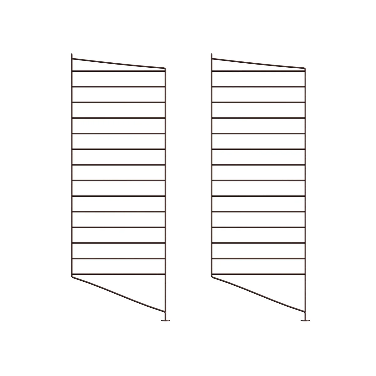 Alle Bodenelemente des String Regalsystems Walnuss gibt es auch in anderen Furnierausführungen wie Birke natur oder Eiche natur, sowie MDF schwarz oder MDF weiß lackiert. Die Seitenelemente aus Stahl sind in weiß, schwarz oder grau erhältlich. Um Durchbiegung zu vermeiden, wird eine gleichmäßig verteilte Belastung von max. 15 kg pro 78 cm breitem Regalboden und 20 kg pro 58 cm breitem Regalboden empfohlen.