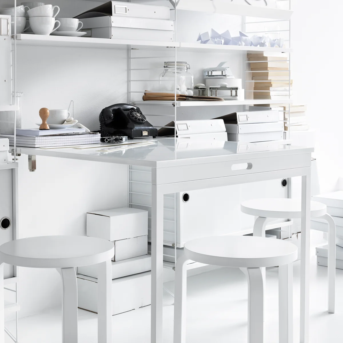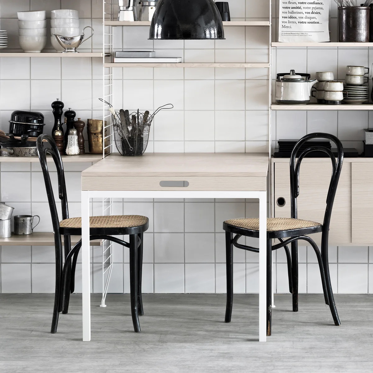 Mit dem Klapptisch von String wird das Regalsystem im Handumdrehen zum zusammenklappbaren Esstisch, der sich toll in der Küche, dem Wohnzimmer oder dem Esszimmer macht und sich optimal für kleinere Wohnungen und Räume, in denen nur wenig Platz zur Verfügung steht, eignet.
