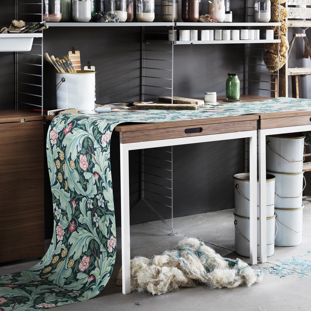 Der Klapptisch von String wird aus verschiedenen Holzarten hergestellt und ist in verschiedenen Farben erhältlich. Das Gestell besteht aus Stahl. Er ist kompatibel mit allen Wand- und Bodenleitern, die eine Tiefe von 30 cm haben.