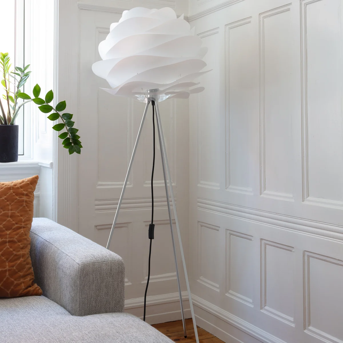 In den Farben Schwarz und Weiß bleibt das Umage Lampengestell im Hintergrund und lässt den extravaganten Leuchtenschirmen den Vorrang. Egal, ob als Nachttischleuchte oder ausgefallene Stehleuchte im Wohnzimmer, mit den Tripod-Gestellen lassen sich im Nu ausgefallene Lichtkonstruktionen zusammenbauen.
