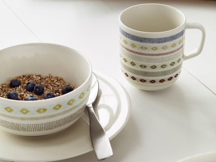 Die Kaffeetassen von Marimekko zieren weltbekannte Muster wie das ikonische Räsymatto Muster stammt von Maija Louekari oder das Unikko-Muster von Maija Isola, das seit 1964 einen Siegeszug durch alle Accessoire-Bereiche feiert. Koziol versieht seine Kaffeebecher mit einem Kunststoffring, der nicht nur ein auffälliges Detail darstellt, sondern auch die Finger vor dem heißen Getränk schützt. Stelton bietet einen ganz besonderen Blickfang: Der Circle Henkelbecher ist vollständig organisch geformt, mit einer kreisrunden Vertiefung dort, wo der Henkel ansetzt – ein stilvolles Detail. Rosendahl bleibt seiner Grand Cru Linie treu und versieht seine Kaffeetasse mit den charakteristischen Rillen. Und Iittala bietet mit der Kollektion Sarjaton eine wahrhaft sanfte Tasse: Weiche Konturen treffen auf ein Muster, das an Strick erinnert.